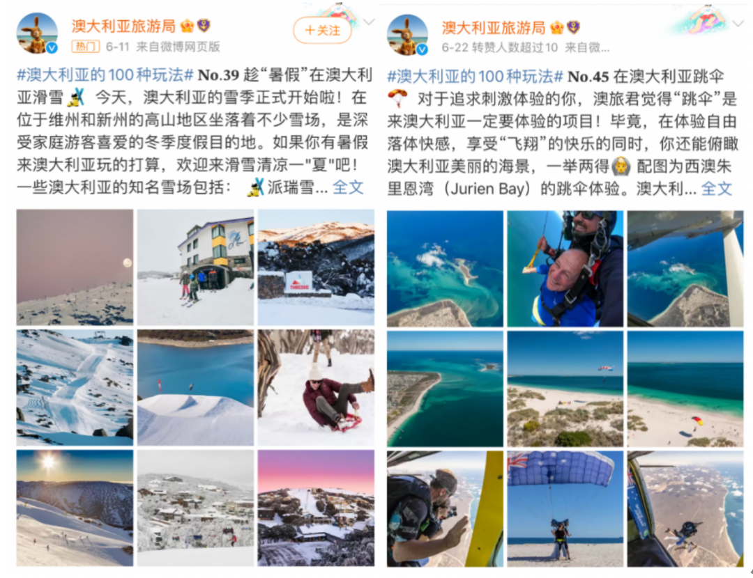 @澳大利亞旅游局 就曾在官方微博發(fā)布#澳大利亞的100種玩法#話題,為用戶帶來系列性的旅行攻略。其也曾發(fā)布悉尼繽紛燈光音樂節(jié)等主題活動(dòng),用戶可以通過品牌號瀏覽和搜索各類信息,對當(dāng)?shù)靥厣顒?dòng)進(jìn)行集中了解。