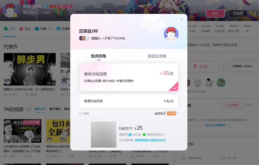 B站顯然也意識(shí)到了這一點(diǎn)。為了鼓勵(lì)UP主創(chuàng)作優(yōu)質(zhì)原創(chuàng)內(nèi)容,B站早在2016年就發(fā)布了“充電”功能,這是一種網(wǎng)絡(luò)增值服務(wù)。用戶可以選擇給自己喜歡的UP主充電,以此來表達(dá)自己的支持和喜愛。B站會(huì)按照用戶給特定UP主的充電數(shù)量計(jì)算出充電收益,并以貝殼的形式發(fā)放給UP主。