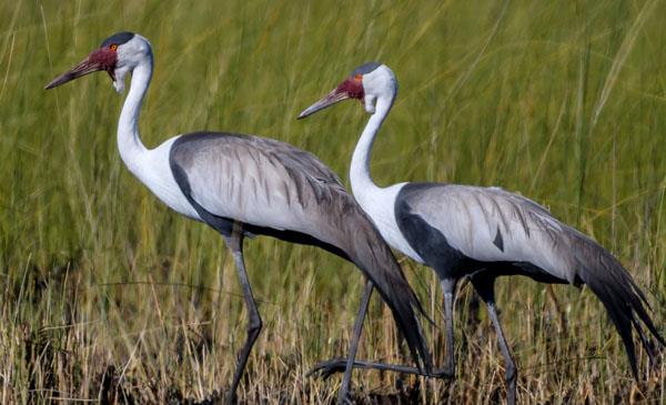 雄鶴裸露的頭頂呈灰色,雌鶴則帶白色。