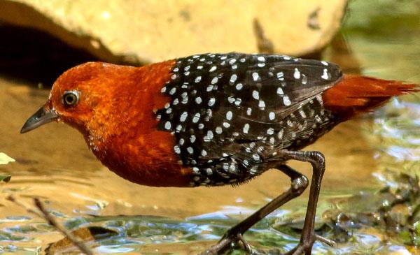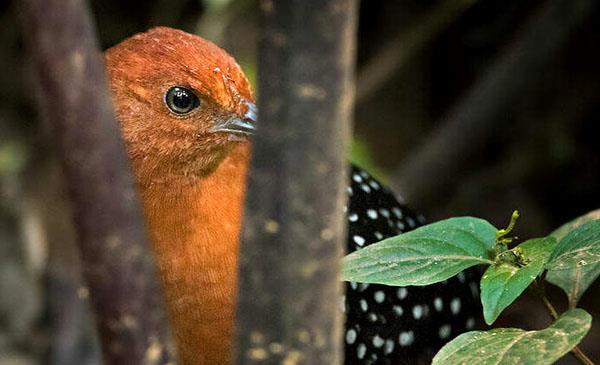 雄鳥羽毛通體赤褐色,黑色的翅膀布滿醒目的白色斑紋。雌鳥羽毛顏色較為暗淡。