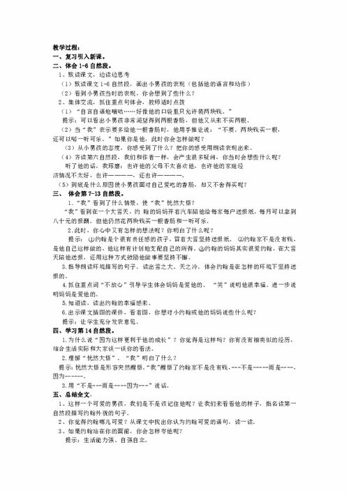 (3)抓住聯(lián)系進(jìn)行思考:第22課“小泡泡”(P107);第21課“小泡泡”(P103);第7課第二題(P31) (4)順著文章思路進(jìn)行思考:第18課第二題(P90) (5)聯(lián)系生活實際進(jìn)行思考:第29課“小泡泡”(P144) (6)有條理地復(fù)述:第31課第二題(P151)2、體會文章的思想感情:(1)朗讀和想象,體會童話揭示的道理:第9課第二題(P44);第11課第二題(P53);(2)聯(lián)系文中的具體事例體會作者的思想感情:第15課第二題(P72);(3)展開聯(lián)想和想象體會思想感情:第17課第三題(P84);第20課第二題(P102);(4)聯(lián)系上下文從句子中體會人物的想法:第21課第二題(P105);第22課第二題(P108) (5)結(jié)合課文和生活實際體會思想感情:第29課第二題(P145) (6)領(lǐng)悟文章的結(jié)構(gòu)特點和表達(dá)方法:第13課“小泡泡”(P63);149頁:小泡泡“點睛之筆”3、閱讀方法:語文園地七“我的發(fā)現(xiàn)”查閱相關(guān)資料、聯(lián)系上下文理解課文的方法;4、閱讀積累:背誦課文:(1)全文背誦:第5課《古詩兩首》、第6課,《爬山虎的腳》、第20課《古詩兩首》 (2)選段背誦:第1課《觀潮》。