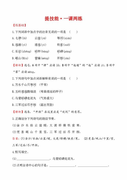 五嶺逶迤騰細(xì)浪, 烏蒙磅礴走泥丸。 金沙水拍云崖暖, 大渡橋橫鐵索寒。